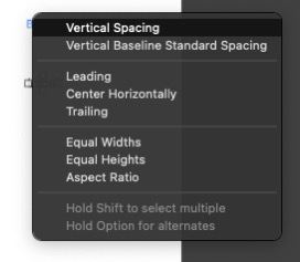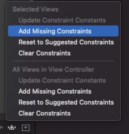 3) resolve auto layout버튼에서 "Add Missing Constraints"로 한번에 설정 (단 크기 유지 안될 수 있으므로 비추천)